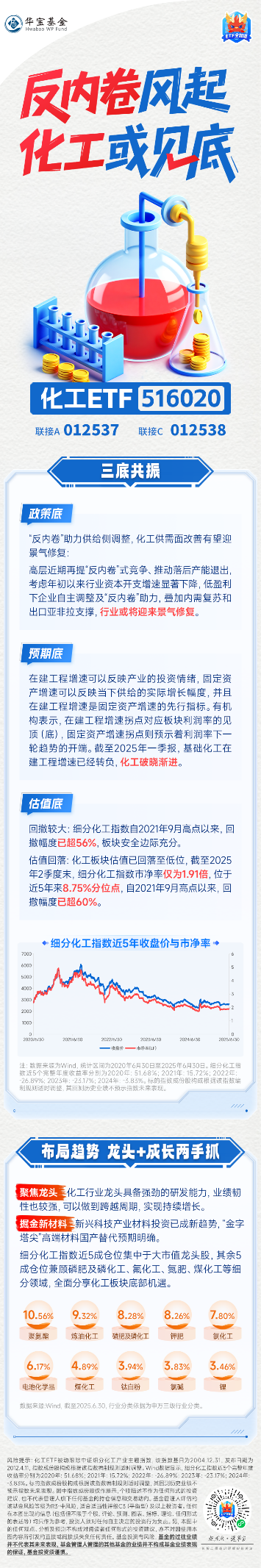 1、龙头集中度优势:该ETF重仓于万华化学、盐湖股份等大市值龙头,充分受益于行业整合带来的 “强者恒强” 效应,其余仓位覆盖磷化工、氟化工等细分领域龙头,分散风险的同时捕捉结构性机会。