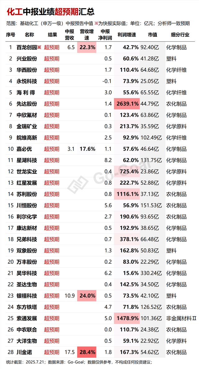 另外,根据朝阳永续业绩前瞻数据,基础化工行业(申万一级)25年中报超预期公司共计28家,数量较多,同样验证景气度提升。